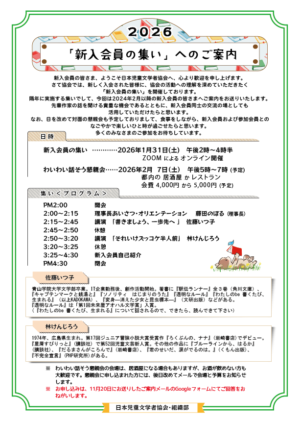 その場合は、事務局に、新入会員の集いの案内希望とメールしてくださいね。ぜひ、おまちしています。