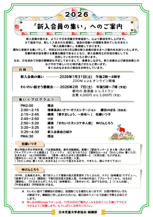 その場合は、事務局に、新入会員の集いの案内希望とメールしてくださいね。ぜひ、おまちしています。