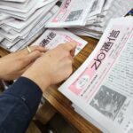Zb通信を単一乾電池を使ってぎゅぎゅっと折ったら、「日本児童文学」と、お知らせ(今回は役員選挙のお知らせです。みなさん、投票しましょう!)を整えて封筒に入れ、テープで封をしていきます。