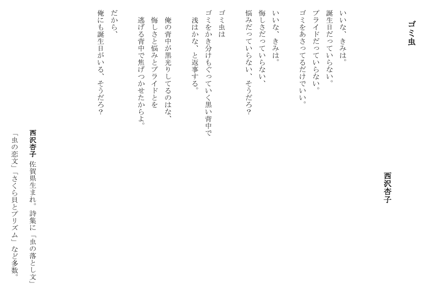 今月の詩 ゴミ虫 西沢杏子 2025.11.01 あさやけ ゆうやけ 山田よう 2025.10.01 星のない窓 わだ ようこ 2025.09.01 太陽へ 小泉周二 2025.08.01 ねこ殿 永窪綾子 2025.07.01 ほんとうのじぶん 石津ちひろ 2025.06.01 青い目 いとうゆうこ 2025.05.01 春へ はたちよしこ 2025.04.01 春がきたよ 宇田川直孝 2025.03.16 こんなときだから 島村木綿子 2025.03.01 12345›